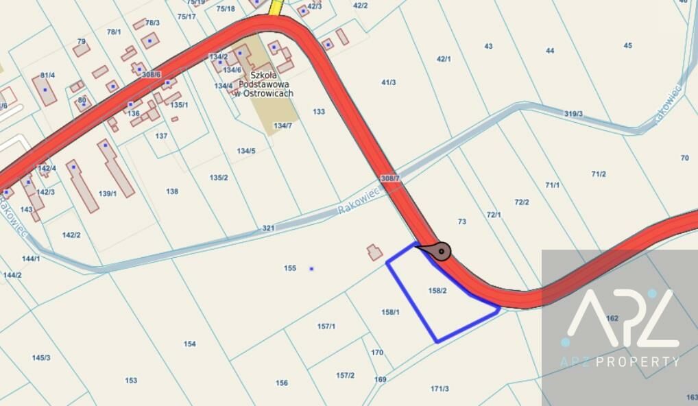 Działka o nr 158/2 o powierzchni 4.260 m. Do nieruchomości przynależą udziały w drodze prowadzącej do drogi wojewódzkiej nr 173.