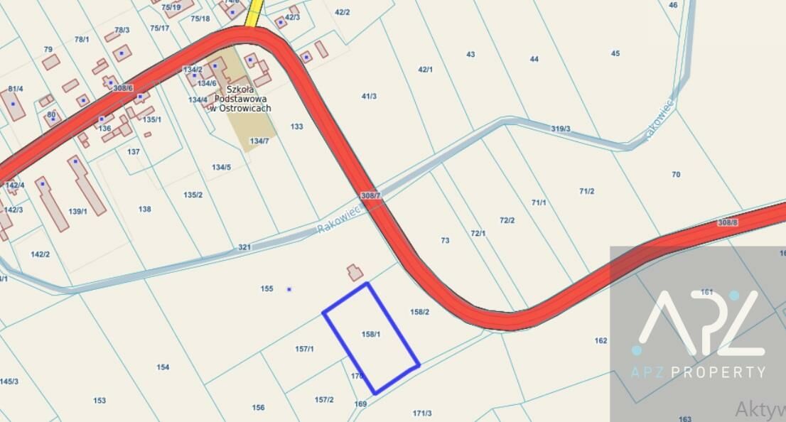Działka o nr 158/1 o powierzchni 4 260 m. Do nieruchomości przynależą udziały w drodze prowadzącej do drogi wojewódzkiej nr 173.